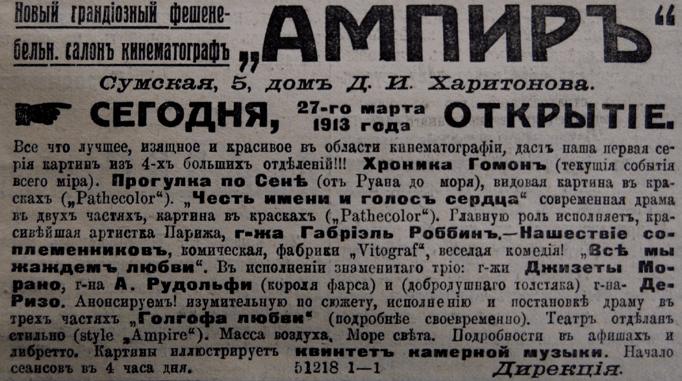 На початку XX століття Харків стрімко розвивався, перетворюючись не тільки на велике промислове місто, а й на розвинутий культурний центр країни. Звичайно, кінематограф, який тільки почав завойовувати серця глядачів, не обійшов стороною й наше місто. У 1913 році заповзятливий купець Дмитро Харитонов відкрив у дворі свого будинку на вулиці Сумській, 5 двоповерховий кінотеатр “Ампір”.