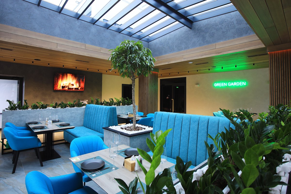 • “Green GARDEN”. Це банкетна тераса, яка працює цілий рік і може вміщувати великі компанії. Панорамні вікна, велика кількість зелених рослин та спокійна колірна гама – все це створює атмосферу затишку та комфорту, з якої не хочеться йти. Тут можна проводити вечірки у форматі фуршету, тоді кількість запрошених може бути до 120 осіб. А якщо вечірка проводиться у форматі банкету – до 50 осіб.